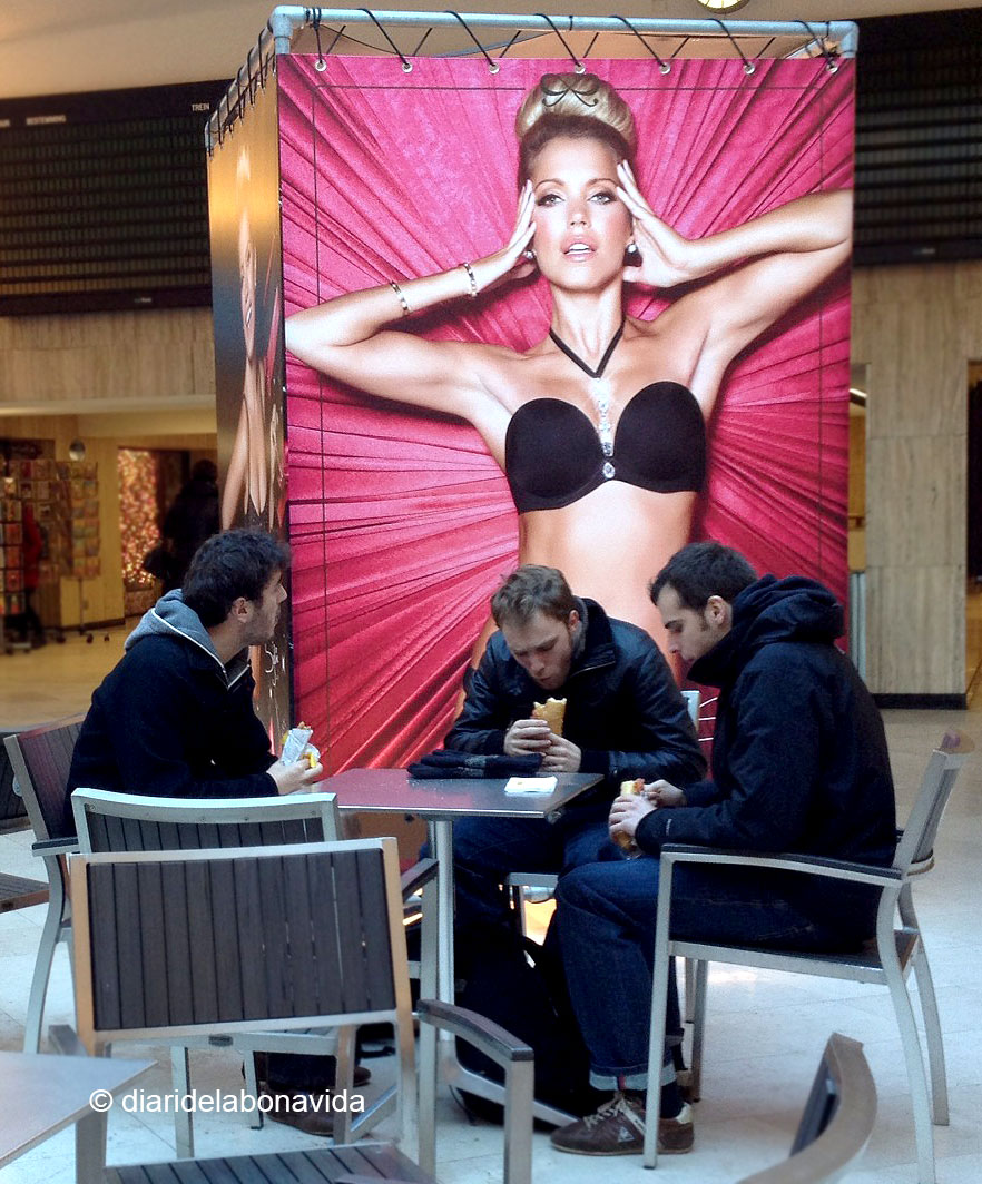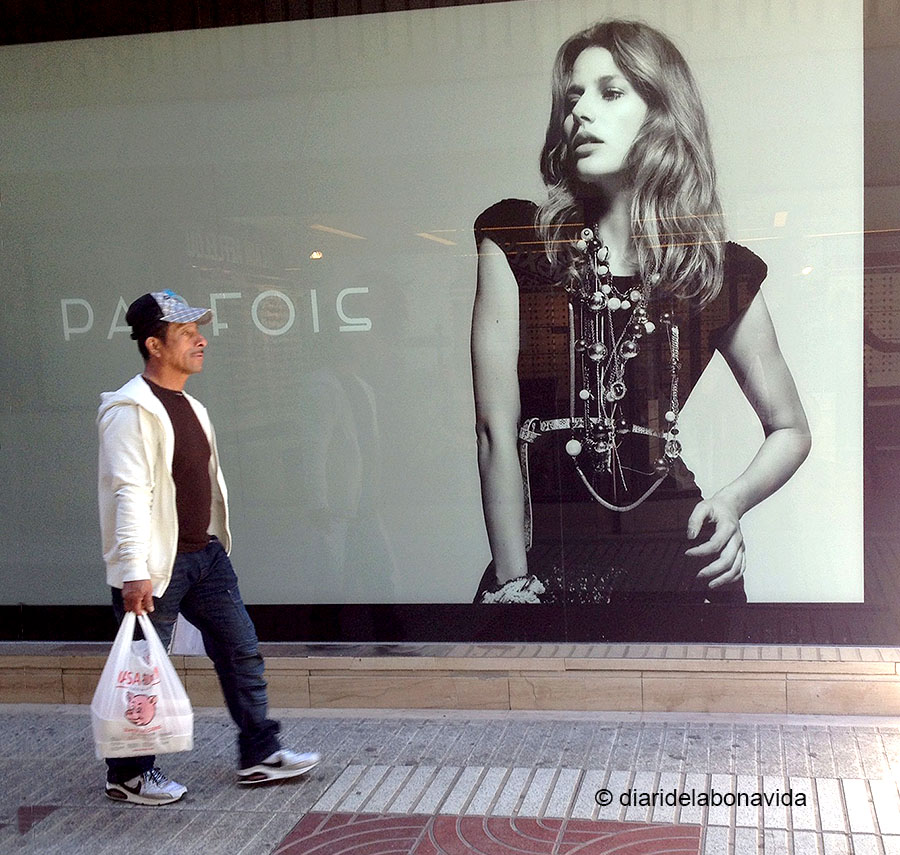 I encara més, dins de la fotografia de carrer, podem buscar altres temes relacionats. Un dels que més ens agrada, és el de jugar amb les persones i els aparadors de les botigues. Es tracta de buscar alguna complicitat entre el que ens mostren els aparadors, on normalment hi ha grans fotos de publicitat, i les persones que poden passar per davant. Quant no anem amb presses, és genial imaginar-se una imatge i esperar una estoneta davant la botiga fins veure com s’apropa la persona indicada.