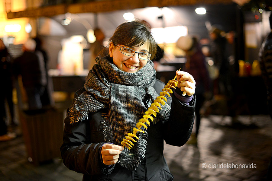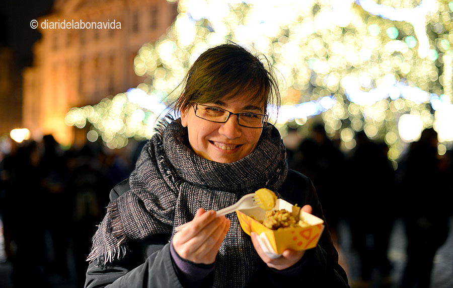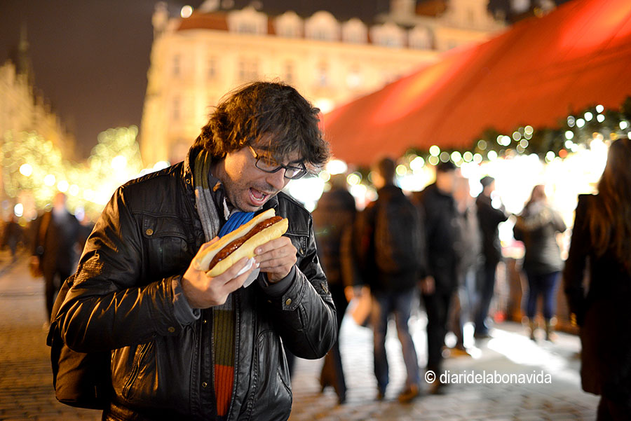 Ai Marina, menjar mentre voltes entre mercats nadalencs és tot un pecat… Impossible parar!! Ens vam fer molt fans dels Trdelník, aquests cilindres ensucrats. Ja ens passaràs l’adreça d’aquesta botigueta on els fan. La visitarem!!