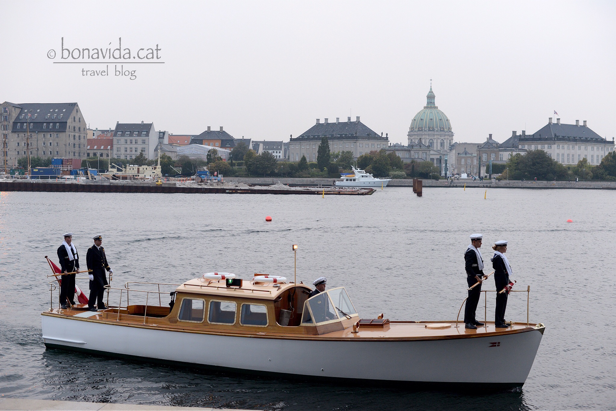 Una petita embarcació s’apropa, la banda de música militar comença a tocar, i els fotògrafs comencen a disparar com bojos. -“Són ells“- ens diu la nostra “confident” danesa. Ens apropem a la porta on han d’entrar i sense que ningú ens digui res, veiem com tota la comitiva passa a tocar nostre.
