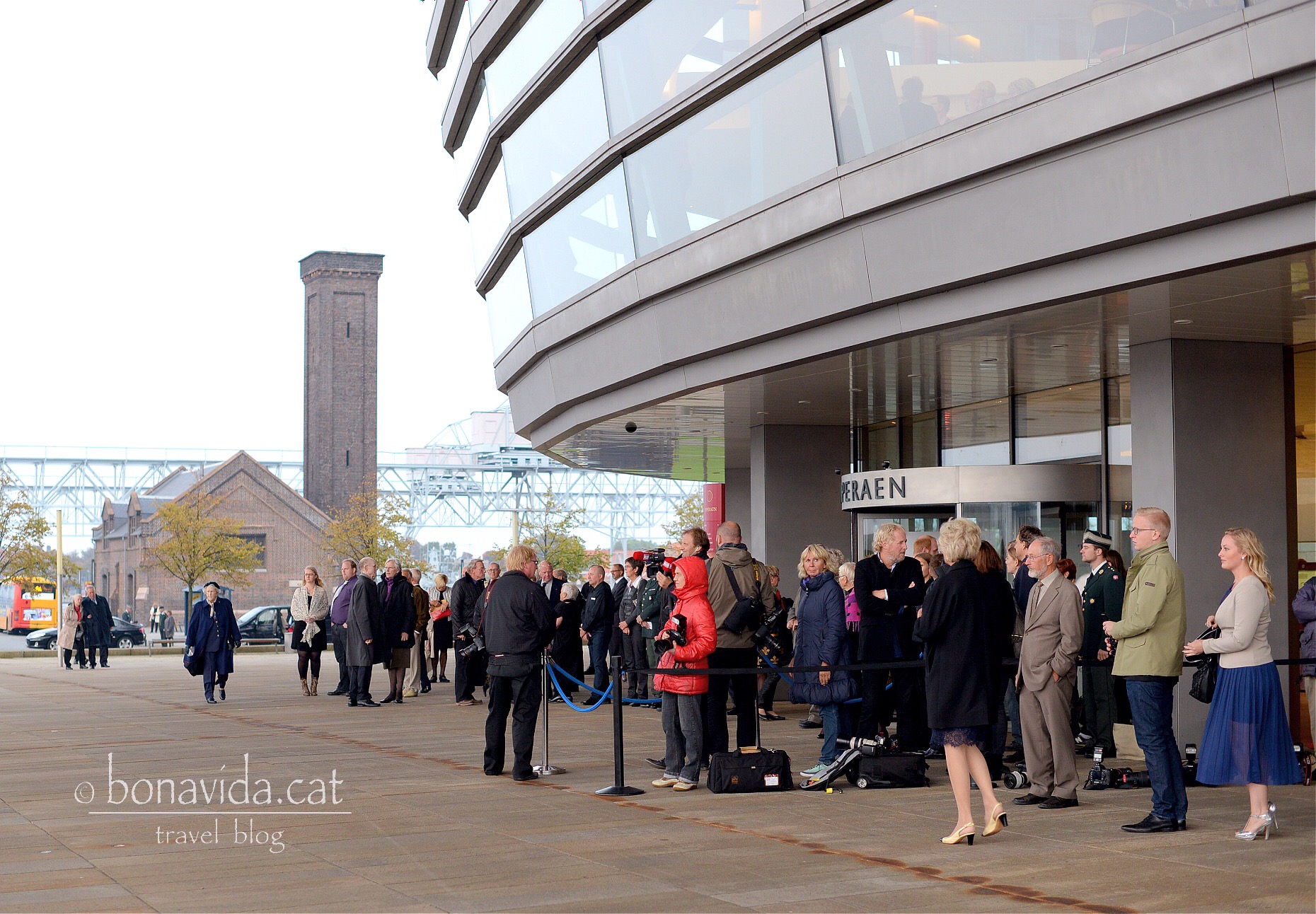 Arriben fotògrafs, periodistes i mitjans gràfics. És llavors quan una senyora danesa que ronda per allà ens diu si també hem vingut a veure als membres de la Casa Reial? -“Els reis?? Doncs no. Som turistes i voltàvem per aquí“- responem. -“Estan a punt d’arribar. La reina i els prínceps creuaran el canal des del seu Palau Reial per presidir l’acte“.- ens diu. -“Així ara ens faran fora d’aquí aviat, oi?“- repliquem. -“Noooo. És molt fàcil apropar-se als reis. Ja ho veureu!“- diu amb un somriure.