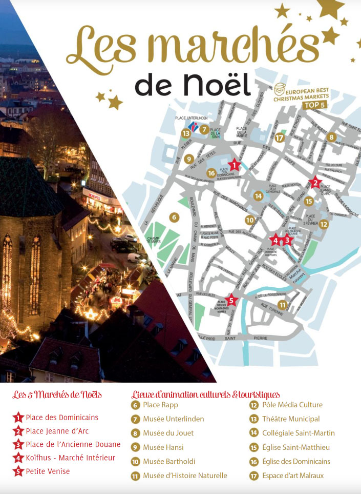 La decoració nadalenca, la seva atmòsfera màgica, els carrers i les cases típiques tenen un aire encantador. Podem trobar fins a 6 Mercats de Nadal, més alguna zona amb atraccions com una pista de patinatge i una petita muntanya russa infantil a la Place Rapp.