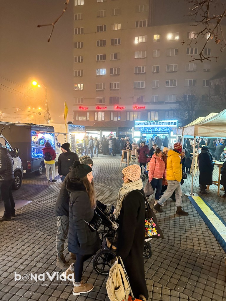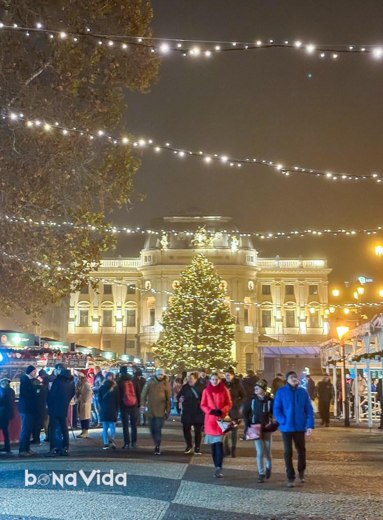 - Plaça Hviezdoslavovo : hi ha més parades de menjar i begudes aquí que a la plaça principal. A més, la zona és una mica més àmplia, de manera que la plaça no està tan plena. Hi ha un gran arbre de Nadal al centre de la plaça, just al costat de la pista de patinatge sobre gel.